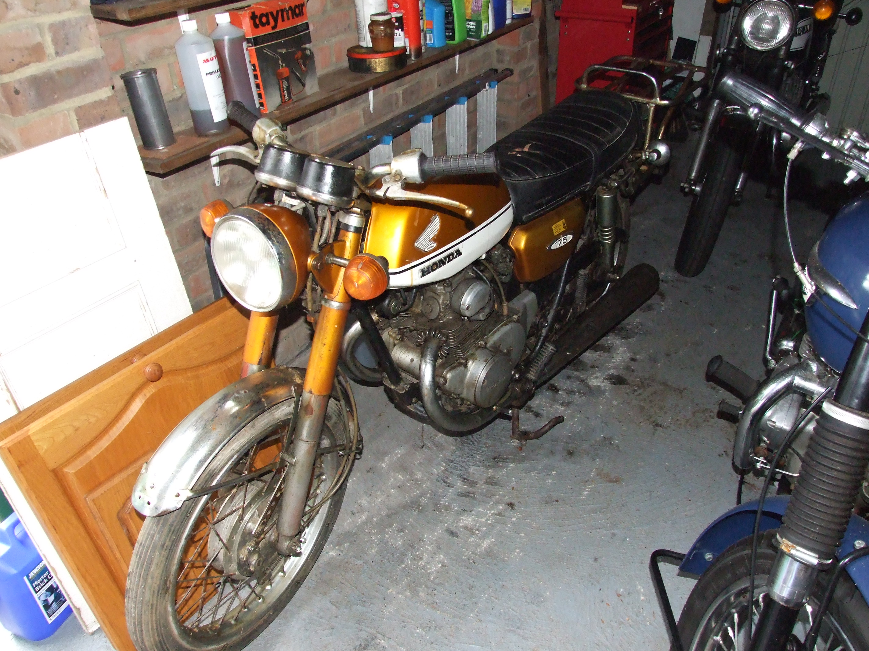This 1971 Honda CB175 K5 is a recent addition to the garage having sat in someone else’s garage for 20 odd years until I came along. The ambition with this one will be to do a complete restoration to as close to a showroom look as time, money and skill will allow me to get. It’s not a bad place to start from, the engine runs, all the bits are there although a couple of non-standard changes will need to go and all the important stuff doesn’t appear to have seized up. So with luck it will just be a case of careful dismantling, sending bits off to be plated, blasted, painted etc. as appropriate then lots of tlc in the re-assembly. Of course things never go that smoothly and the first thing to go wrong was one of the float bowls doing a disintegration act when taken off. So if anyone has got a suitable replacement sitting in the parts bin please get in touch, in fact pretty much any CB175 bits could be of interest.