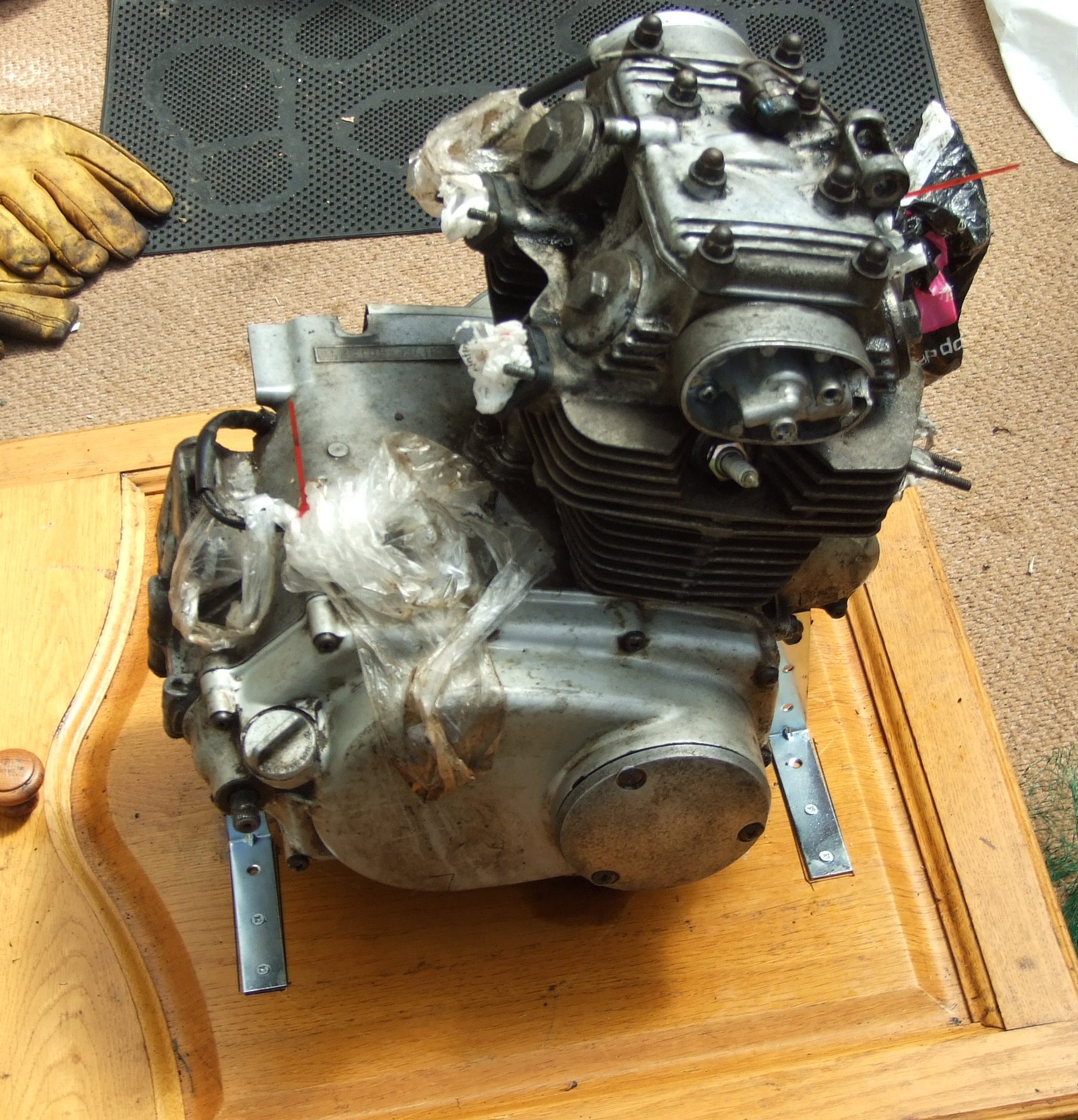 This has been going pretty well. Contrary to my expectations virtually all the bolts/nuts/crosshead screws have (so far) come undone with only minimal amounts of swearing. Getting the engine out the frame was a bit of a heave but once done a trip to the hardware store and a bit of recycling of an old kitchen cabinet door and I had it on an ad hoc engine stand.